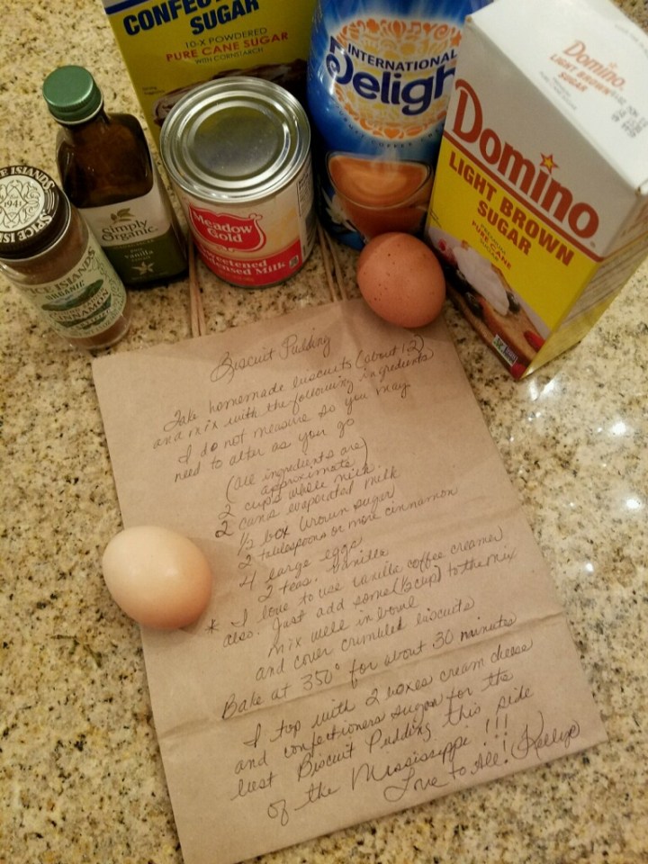 Disclaimer-The Biscuit Pudding Recipe is supposed to say Condensed Milk not evaporated!